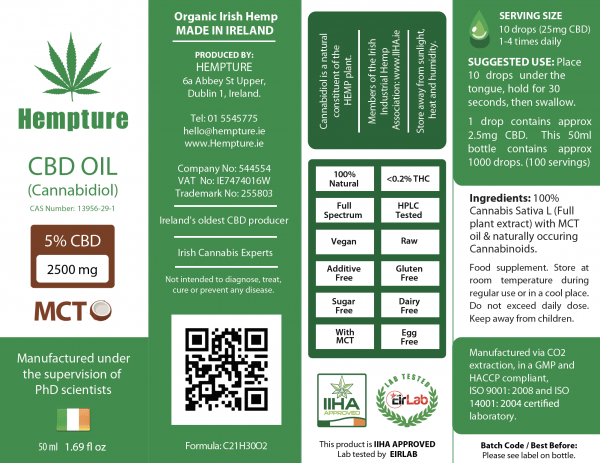 Hempture CBD oil is made from organically grown cannabis plants. Our 100% natural RAW CBD oil contains the full-spectrum of Cannabinoids. Hempture CBD oil and its packaging is produced in Ireland. Our crops are grown under strict government licences within the EU.