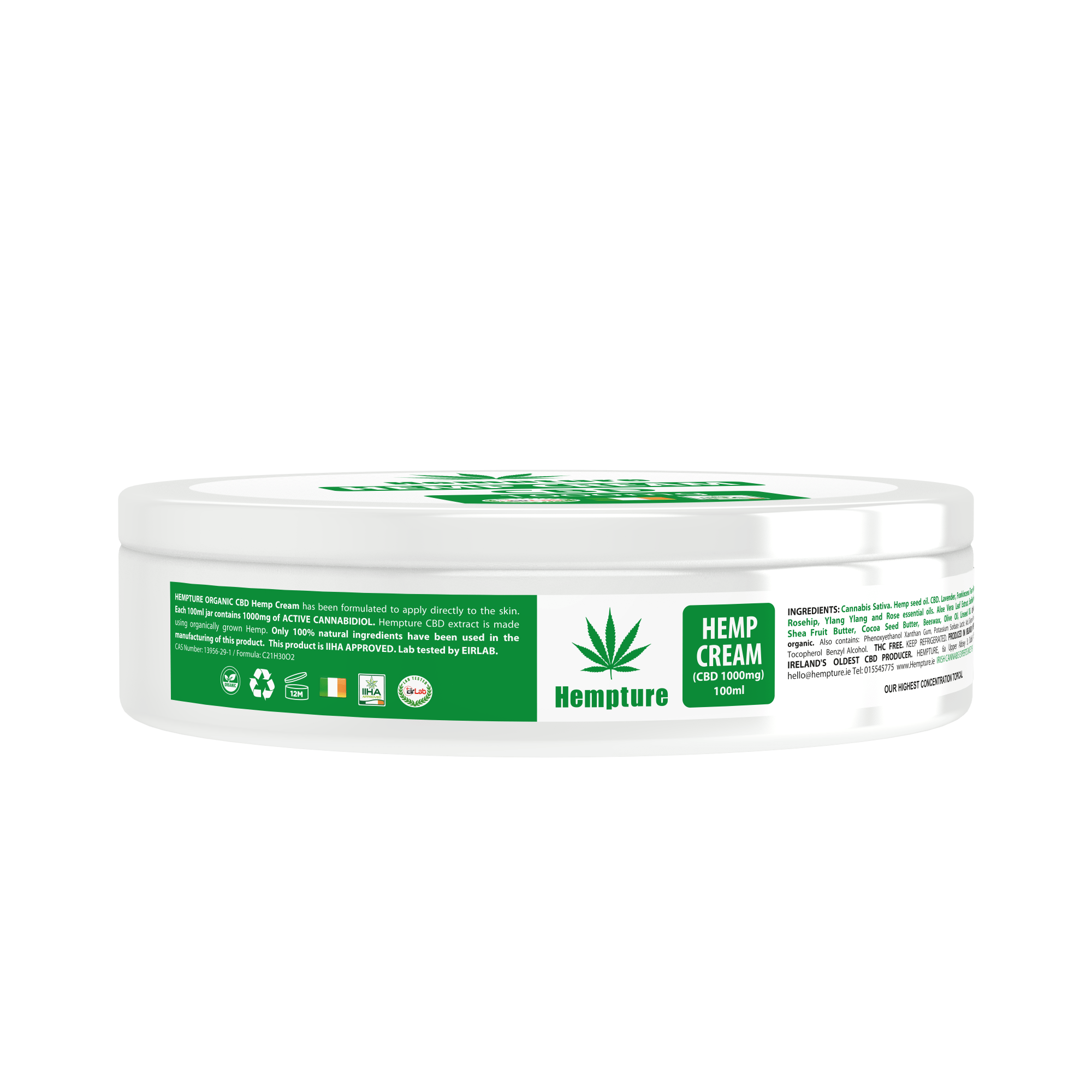 HEMPTURE ORGANIC CBD Hemp Cream has been formulated to apply directly to the skin. CBD that is applied topically is directly absorbed through the skin. Each 100ml jar contains 1000mg of ACTIVE CANNABIDIOL. Hempture CBD extract is made using organically EU grown Hemp. Only 100% natural ingredients have been used in the manufacturing of this product. This product is IIHA APPROVED. Lab tested by EIRLAB.